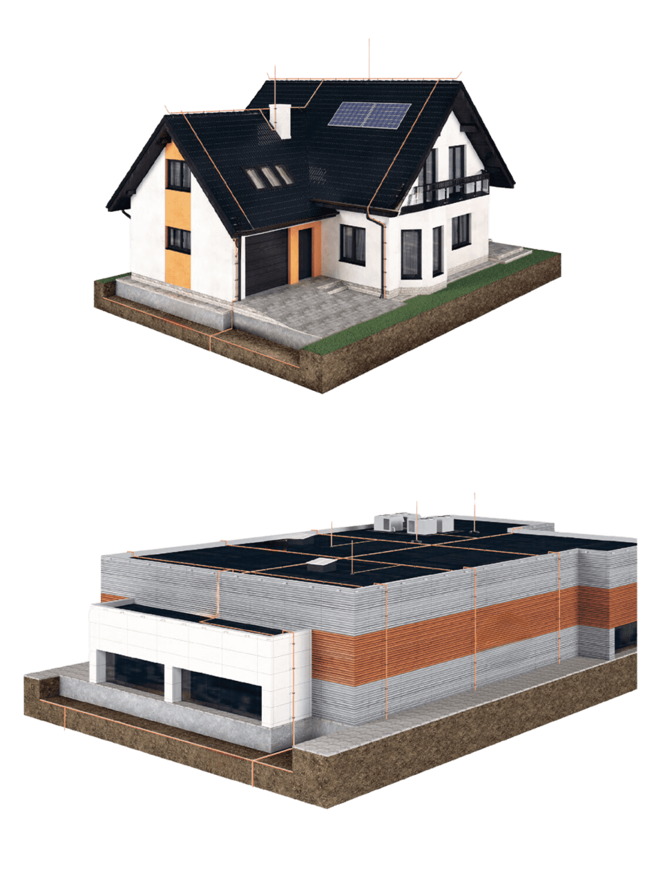 Piedāvājam visaptverošus risinājumus zibensaizsardzības un zemējuma sistēmu projektēšanai un uzstādīšanai.